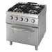 Naast het vierpits-fornuis beschikt dit gasfornuis ook over een ruime oven op gas. De statische ovenkamer is volledig van rvs waarbij de deur zelfs met 40 mm dik rvs extra zwaar is uitgevoerd. De binnenkant heeft een chromen rek met drie niveaus waarop je 2/1 GN-bakken kunt plaatsen. Je kunt temperaturen instellen tussen de 100 en 300 graden Celsius.