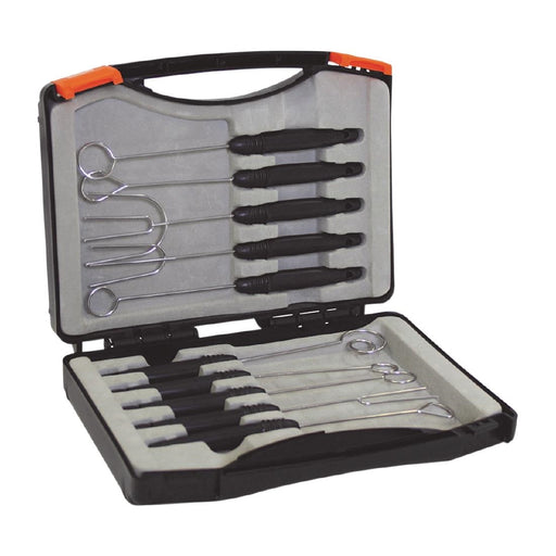 RVS doorhaalvorkjes in duurzaam ABS koffer. Bevat: ronde 14mm, 16mm, 18mm, 20mm, driehoekige, spiraalvormige, druppelvormige vork, 2-, 3- en 4-tand...