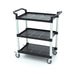 Deze serveerwagen kan je veel loop- en tilwerk besparen omdat je de serveerwagen het werk laat doen. Hij is ideaal voor het vervoeren en serveren van maaltijden. De serveerwagen is ook een uitstekende hulp bij het opruimen van vuile vaat in de keuken. Deze professionele serveerwagen is voorzien van drie kunststof werkbladen.