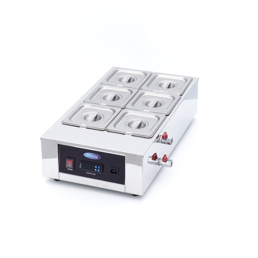 Eenvoudig chocolade smelten kan met deze mooie chocoladesmelter. Hij is voorzien van 6 GN containers met 1/6 GN formaat, een diepte van 10 cm en wo...