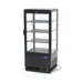Met een inhoud van 78 liter en de drie bijgeleverde roosters beschikt deze stevige koelvitrine over voldoende ruimte voor het koelen en presenteren van uiteenlopende producten. Denk aan belegde broodjes, drankjes, salades en zuivelproducten. De gekoelde vitrine is niet alleen erg praktisch, maar dankzij de vier glazen ramen en de ingebouwde LED-verlichting ook ideaal voor het mooi presenteren van producten. Zeer geschikt voor in de bakkerij of horecazaak om klanten te laten zien welke producten je aanbiedt. Een ander voordeel van de mini koelvitrine is dat deze is voorzien van vaste poten en een slot met twee sleutels.