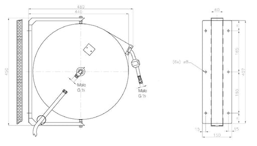 - Hose reel including hose and gun - Material: (reel) stainless steel AISI 304; (shaft, swivel joint) AISI 303; (mainspring) carbon steel; (hose) ...